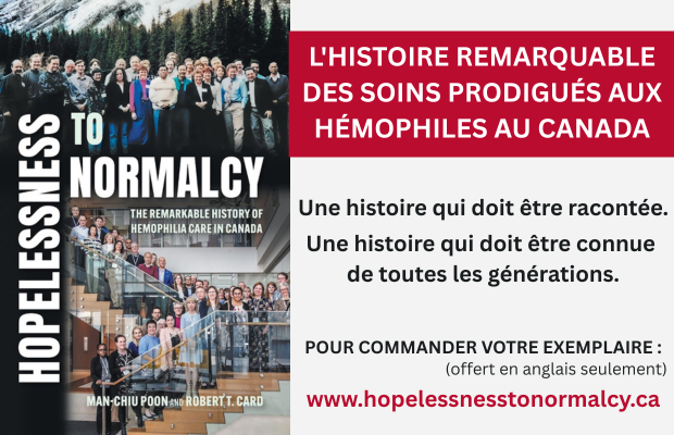 Vous pouvez également consulter un commentaire intéressant de la Dre Kelsey Uminski, directrice médicale du Southern Alberta Rare Blood and Bleeding Disorders Comprehensive Care Program (Centre médical Foothills), et de la Dre Adrienne Lee, directrice médicale du Adult Bleeding Disorder Program of BC (Hôpital St. Paul’s) dans la publication Haemophilia : A Story Worth Telling: The Evolution of Haemophilia Care in Canada – Uminski – Haemophilia – Wiley Online Library.